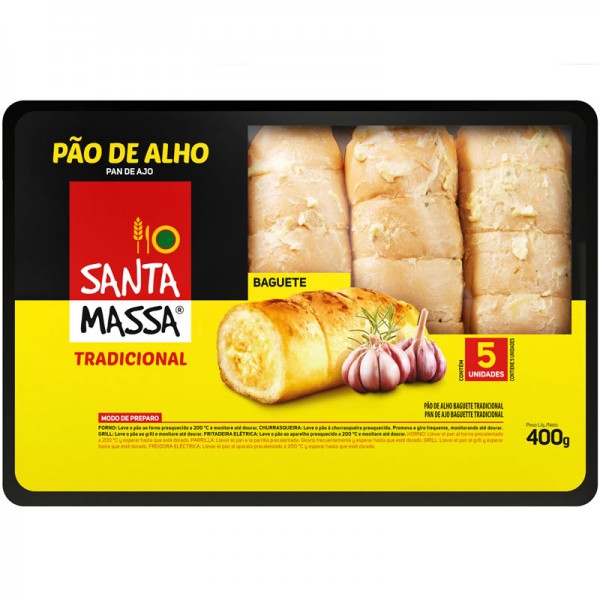 Pan de ajo tradicional Santa Massa. El sabor no viene de sazones artificiales, sino de una receta original especialmente preparada con ajo fresco. ¡Sumado a ella, tiene mucho cariño, dedicación y un toque especial para proporcionarle una explosión de sabor! Contenido 400 g.