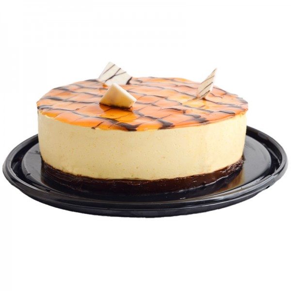 Base de galletas endulzadas, crema mouse de queso y salsa de maracuyá por arriba.