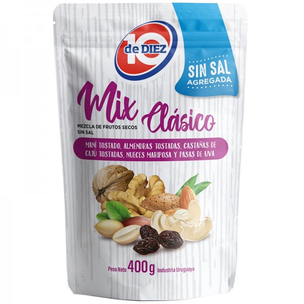 Mezcla de frutos secos sin sal agregada: maní tostado, almendras tostadas, castañas de cajú tostadas, nueces mariposa y pasas de uva.